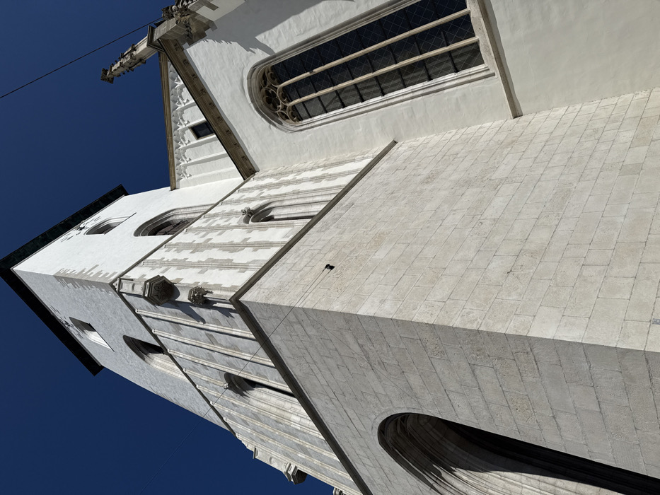 The image displays a low-angle view of the exterior of the Cathedral of St