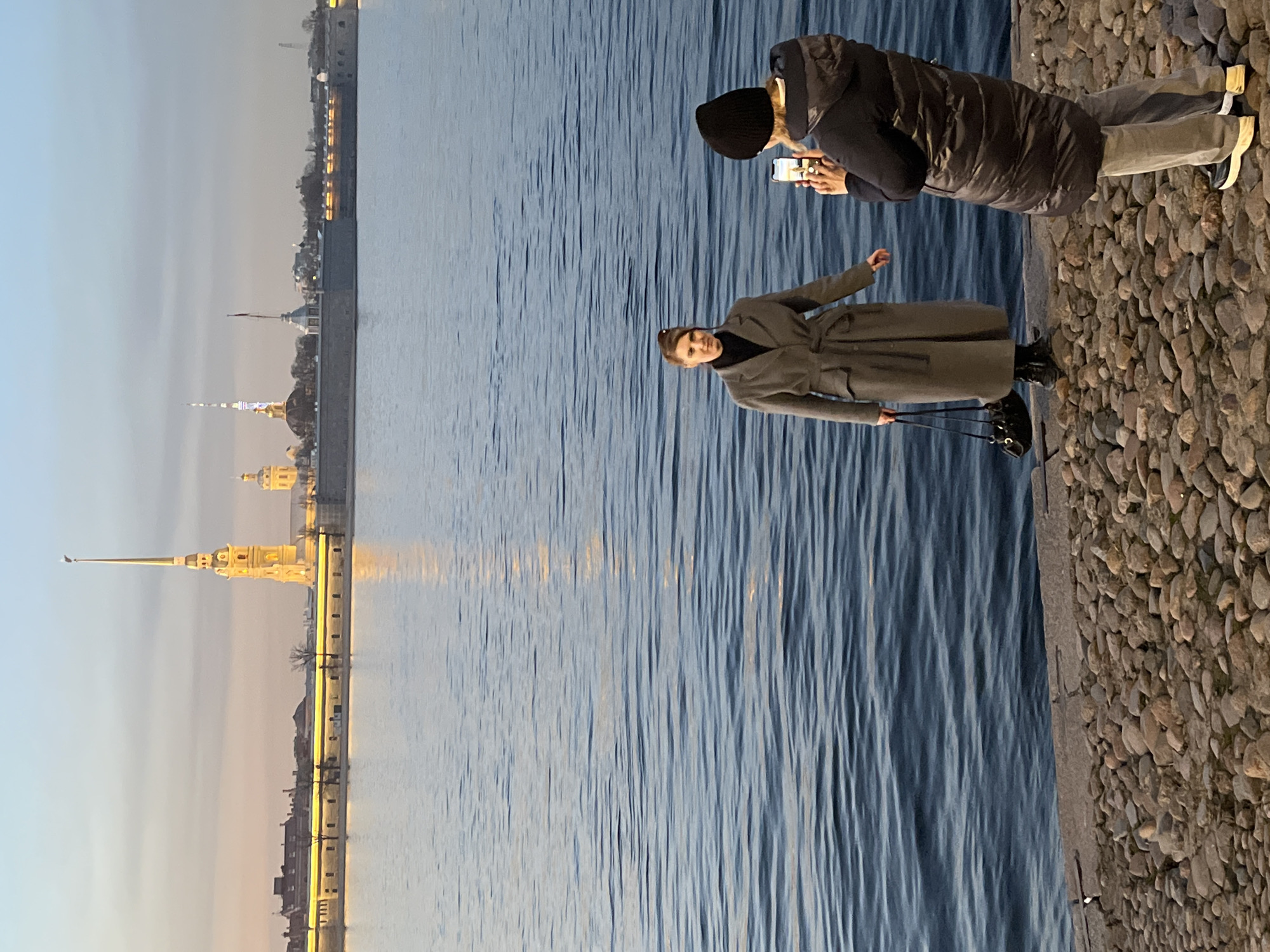 view of the Peter and Paul Fortress in Saint Petersburg, Russia. The fortress is situated across the Neva River, with its iconic golden spire prominently visible against a clear sky at twilight. Two people are standing on a stone embankment. One person is wearing a dark puffer jacket and a black beanie, holding a smartphone, presumably taking a picture. The other person is wearing a grey trench coat and carrying a purse. The scene shows a calm river with reflections of the fortress and the sky. The lighting suggests either early morning or late evening.