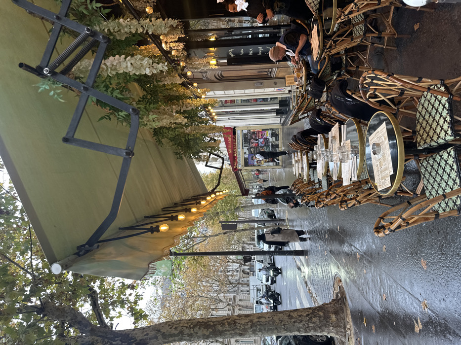 The image depicts a street scene in Paris, France, specifically near the Bastille area, identifiable by a visible "BASTILLE RESTAURANT" sign across the street. The setting is an outdoor cafe on a wet sidewalk, indicating recent precipitation. In the foreground and midground, a cafe extends along the building facade. It features a retractable light-green canvas awning, from which hang string lights with warm yellow bulbs and decorative artificial foliage, including white wisteria-like blossoms and green leaves. Beneath the awning, a series of round, dark-topped tables with metallic bases are arranged on the sidewalk, accompanied by rattan-style chairs fitted with patterned green and white cushions. Many tables are set with stacks of glassware, white menus, and some contain small ashtrays. On the right side of the image, closer to the restaurant entrance, a man with light hair, wearing a dark shirt, is seated at a table, actively consuming food from a plate using a fork. Partially obscured, a staff member in a dark uniform with a white element stands near the building's entrance. On the wet sidewalk to the left, a woman wearing a long beige coat and a dark head covering walks away from the viewer. The pavement shows reflections from the wet surface. The street itself, wet and reflecting light, shows vehicle traffic. Two motorcycles or scooters with riders are visible in the mid-distance, along with several cars. Plane trees with thinning, autumnal foliage line the street. In the background, typical multi-story Parisian buildings with architectural details are visible under an overcast sky.