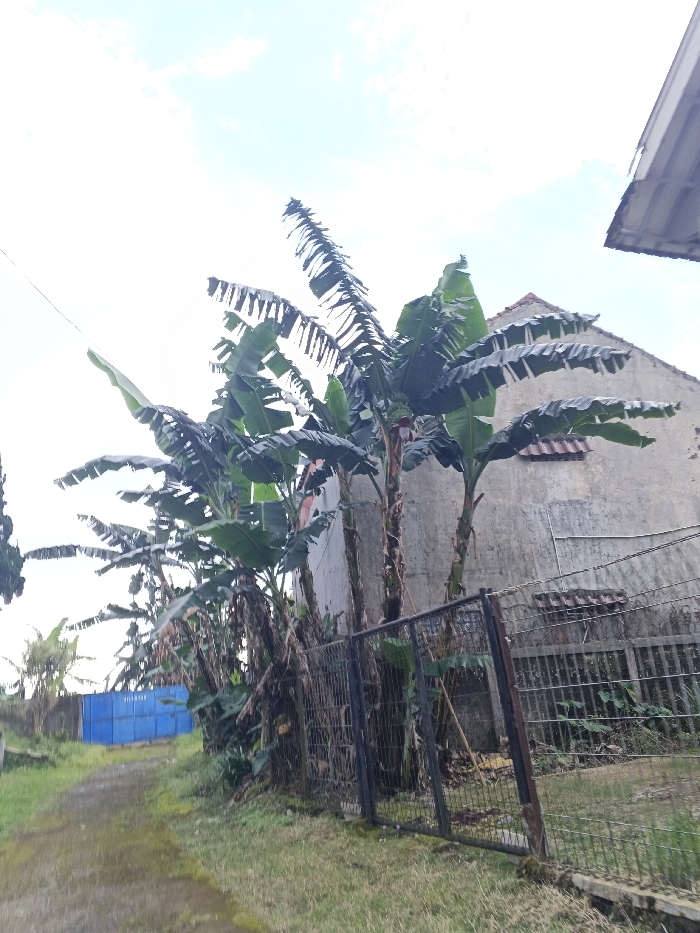 The scene depicts an outdoor environment in Ream Quarter, Cambodia, characterized by vegetation and structures under an overcast or brightly lit sky. A dirt and gravel path, partially covered with moss and sparse green grass, extends from the lower left towards the midground. To the left, distant blue corrugated metal gates are partially visible. A row of multiple banana trees with large, green, partially tattered leaves dominates the midground, several exhibiting nascent banana fruit or flower structures. In front of these trees, a dark, weathered metal mesh fence with some rusting runs horizontally across the frame. Behind the banana trees and fence, on the right, stands a two-story building with light-colored, possibly concrete or stucco, exterior walls and a visible section of a terracotta-tiled roof. Wires are discernible on the building's wall. No individuals are present.