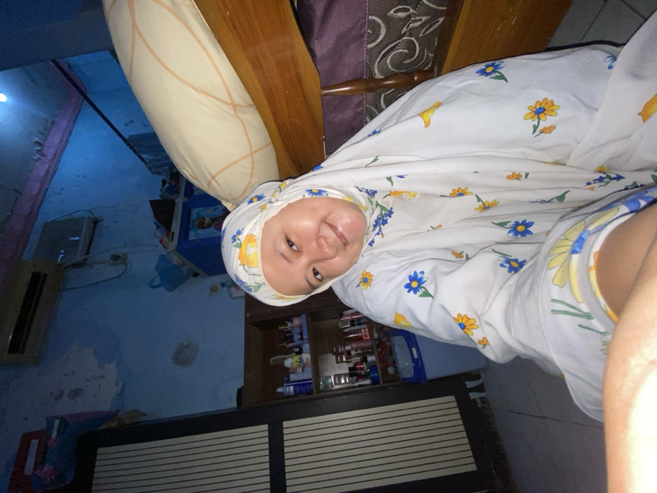 An indoor scene in a room located in Gelam, Indonesia, depicts a female individual seated on the floor, smiling directly at the camera. She is wearing a white full-body prayer outfit (mukena) adorned with a pattern of blue and yellow flowers. The room's walls are painted a faded light blue, showing areas of peeling paint. An air conditioning unit is mounted high on the left wall. A wooden wardrobe and a multi-shelf unit containing various bottles and containers are visible on the left side of the frame. A light blue plastic container rests on the floor near the shelving unit. To the right of the subject, a light-colored pillow rests on a wooden bed frame with a dark bed skirt. The floor is tiled. The lighting in the room is dim, casting a cool blue tone.