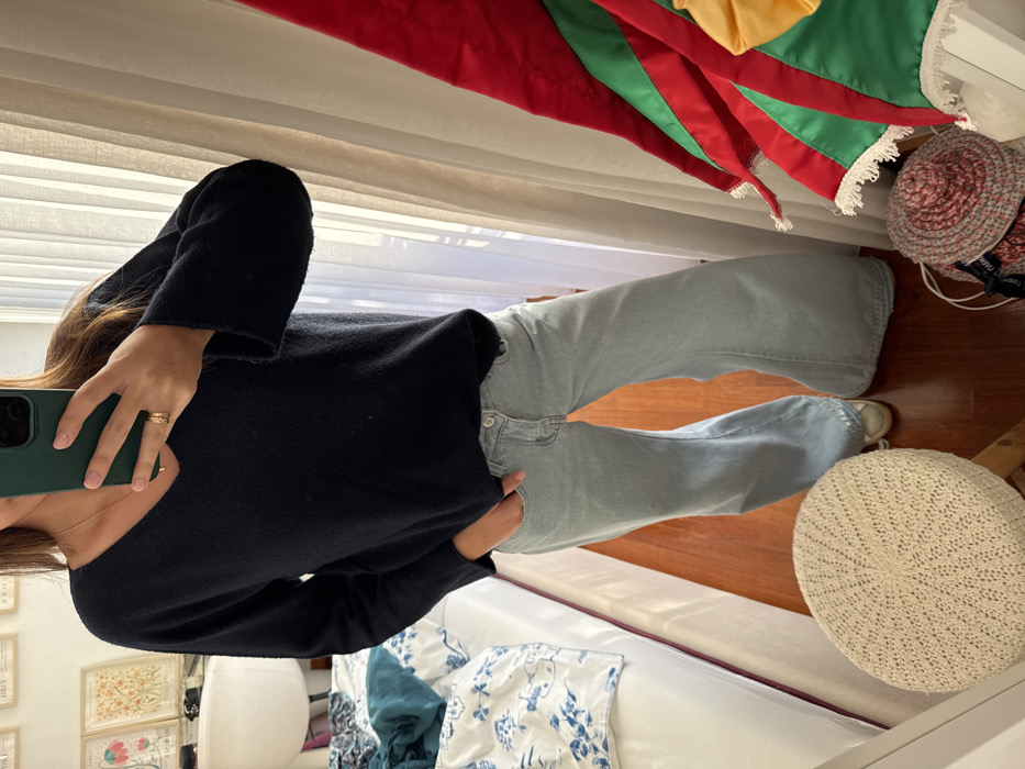 The image depicts a female individual taking a mirror selfie in an interior room located in Vila Nova de Gaia, Portugal. The person is dressed in a dark navy V-neck long-sleeved sweater and light blue, flared-leg jeans. The left hand, adorned with a gold-toned ring, holds a dark green-cased smartphone to capture the reflection. A thin gold-toned chain necklace with a small pendant is visible at the V-neck. The immediate environment includes a polished light brown wooden floor. To the left, a white bed frame with white and blue patterned bedding is visible, along with a dark teal fabric item draped on it. Above the bed, several framed artworks are mounted on a light wall. In the foreground, a round, beige woven stool with wooden legs is present. To the right, sheer white curtains hang, and a multi-colored fabric item featuring red, green, and yellow panels with white fringe is partially visible. A reddish-brown woven straw hat with a dark blue ribbon rests on the floor beneath the fabric item.