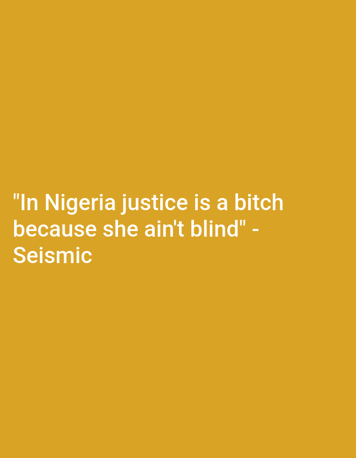 A dark yellow background displays a text quote in a bright off-white font. The quote reads, "In Nigeria justice is a bitch because she ain't blind" - Seismic. The text is centered vertically and horizontally within the image. The overall effect is a simple textual statement against a solid-color backdrop.