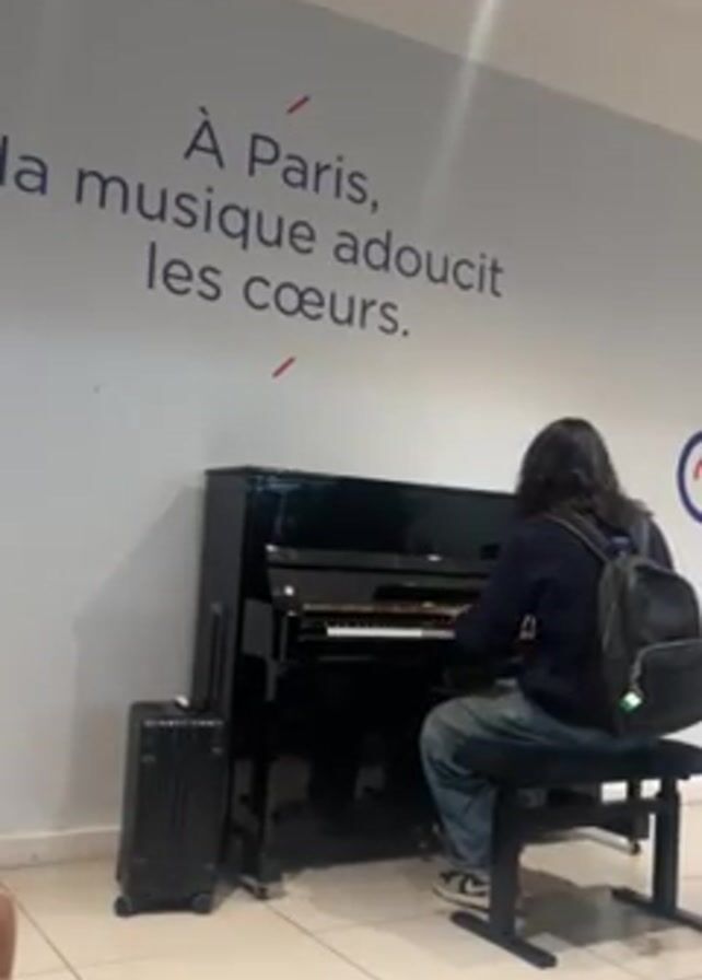 A young adult man is playing a black upright piano in a public space with a white wall behind him. He has long dark hair and is wearing a dark blue jacket, loose jeans, and black and white sneakers. He has a black backpack hanging on the back of his chair and a black suitcase is to his left. He is sitting on an adjustable black bench. The wall behind the piano has blue writing that says "À Paris, la musique adoucit les cœurs." Someone is sitting in the lower left corner. A circular logo is visible on the upper right corner of the wall. The man is playing a melody on the piano.