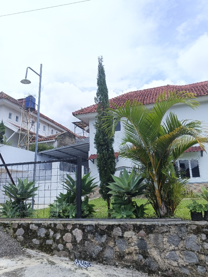 The image depicts a house with a red-tiled roof and white walls, partially obscured by lush greenery. A tall, thin cypress tree stands next to a palm. In front of the house, there's a low stone wall supporting several agave plants. A metal fence runs along part of the property. Visible on the left are parts of another building, a lamp post, and a water tower. A cloudy sky fills the upper portion.