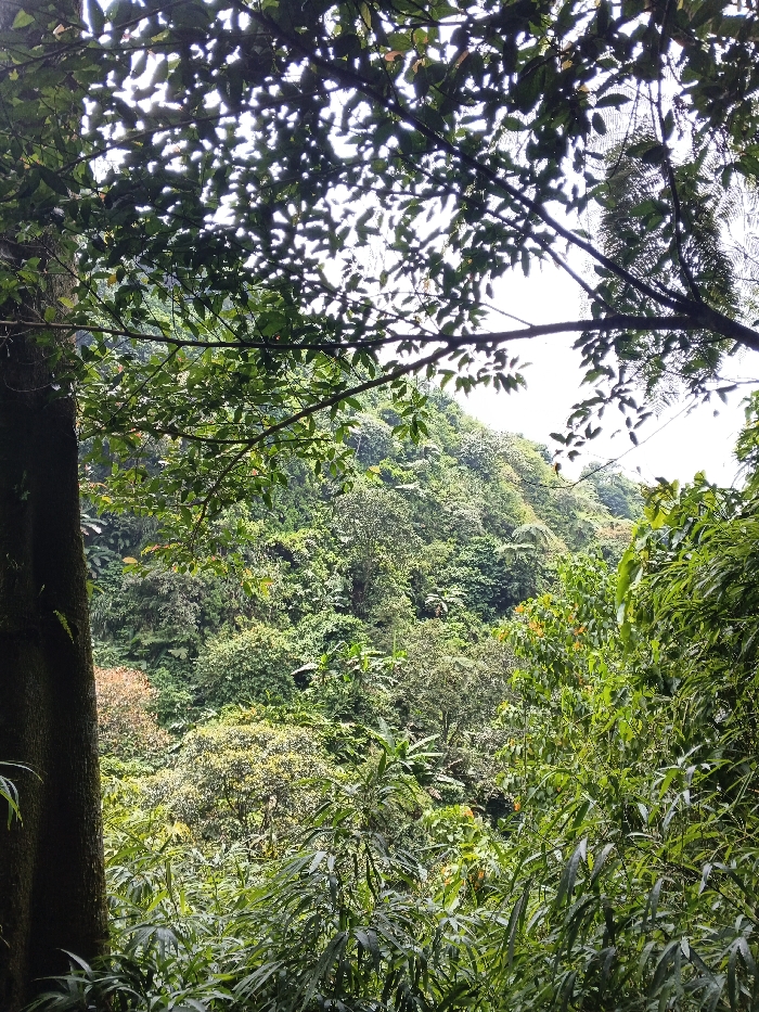 The scene depicts a dense tropical forest environment in Soibada, East Timor. The foreground features a thick, dark tree trunk on the left, with an overhead canopy of various green leaves and branches partially obscuring the sky. The midground and background consist of a steep, heavily vegetated hillside covered with a diverse array of lush green tropical trees and plants. Patches of bright, overcast sky are visible through gaps in the dense foliage in the upper central and upper right sections of the image. A localized area of reddish-brown foliage is present on the mid-left hillside. No people, animals, or man-made objects are visible within the frame; the environment is entirely natural and overgrown.