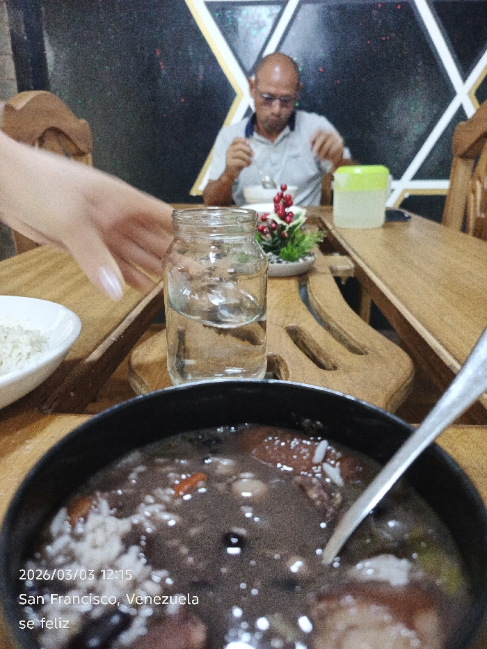 The image depicts an indoor dining scene captured from a low angle, focusing on a meal in progress in San Francisco, Venezuela, on March 3, 2026, at 12:15