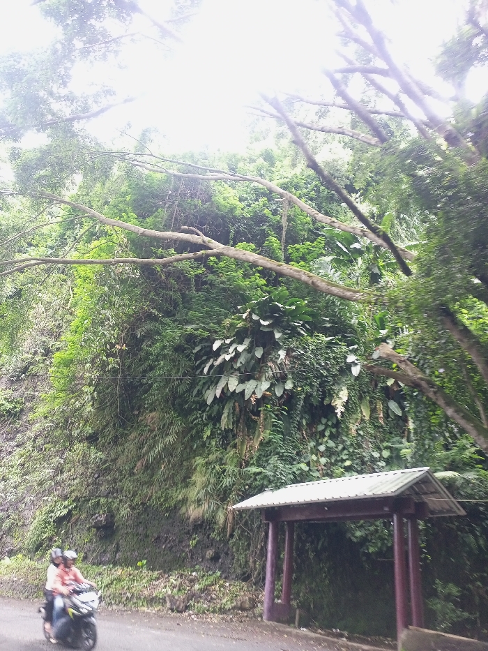 Lush greenery climbs a rocky hillside, punctuated by a small, covered shelter with burgundy posts. A pair of people on a black moped travel along the asphalt road in front of the vegetation. Trees with twisting branches frame the scene, obscuring the sky with dappled shade. The foliage is dense and varied, with large, broad leaves interspersed among smaller, more delicate vines and plants.