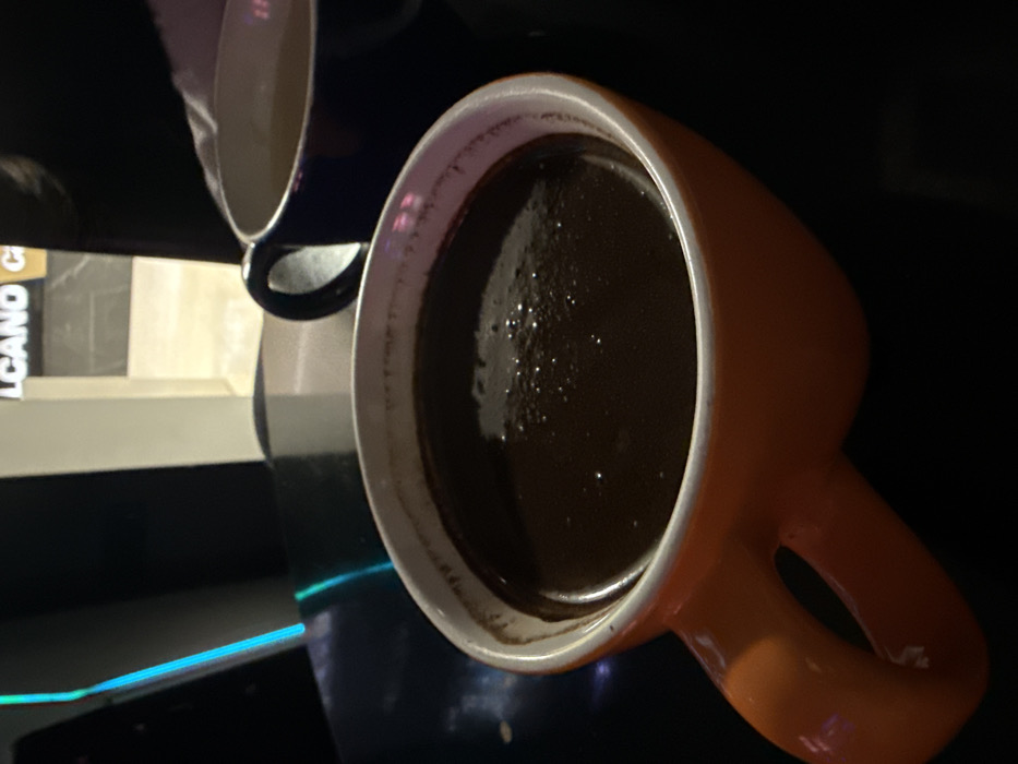 The scene is an interior view, in a dimly lit environment, located in Petrovac centar, Montenegro. Two ceramic mugs are positioned on a dark, reflective tabletop. In the foreground, a large, orange ceramic mug with a distinctive, curved handle contains a dark brown liquid consistent with coffee, featuring a layer of fine froth on its surface. Partially visible behind and to the right of the orange mug is a dark blue ceramic mug, holding a lighter-colored beverage. The background includes a vertical blue-green light source on the left and a partially obscured white sign with black capital letters reading "LCANO C," indicating a "Volcano" establishment, likely a cafe. No individuals are depicted within the frame.