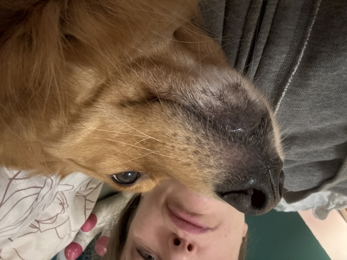 A selfie shows a fair-skinned person with light brown hair and a dog with golden fur. The person's mouth and nose are visible; eyes are partially obscured. The dog's head rests above the person, with its nose dominating the foreground. The dog is light tan, with a large, black nose. A gray hoodie is visible in the background, as is a bed sheet with a floral pattern. The image is rotated, with the person and dog appearing upside down.