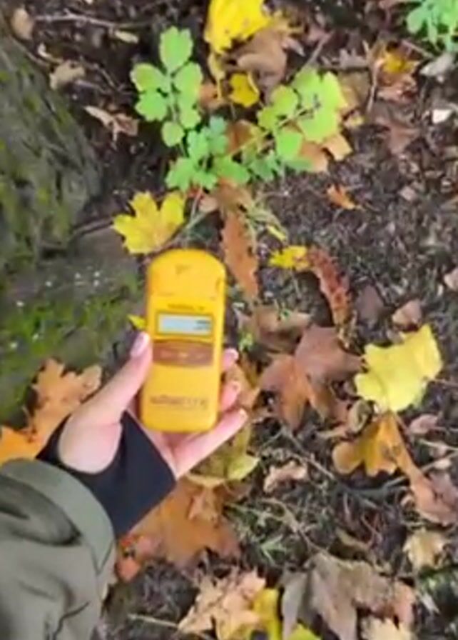 A woman is holding a yellow dosimeter, a device that measures radiation, against a background of fallen autumn leaves, small plants, and bare earth under the trees. The dosimeter reads 0.60 microsieverts, and beeps. The woman has manicured nails. Her left arm is visible, wearing a black fingerless glove and a green jacket.
