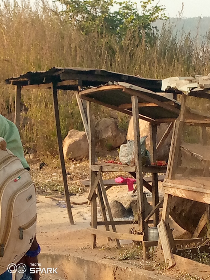 A series of ramshackle wooden stalls with corrugated metal roofs stand along a rough path. Behind the stalls, the landscape is marked by large boulders and overgrown vegetation. Merchandise, including red fruits and a pink garment, rests on the stall shelves. A white backpack with green and red details is prominent in the foreground. The scene appears rural and unkempt, the stalls indicative of roadside commerce.