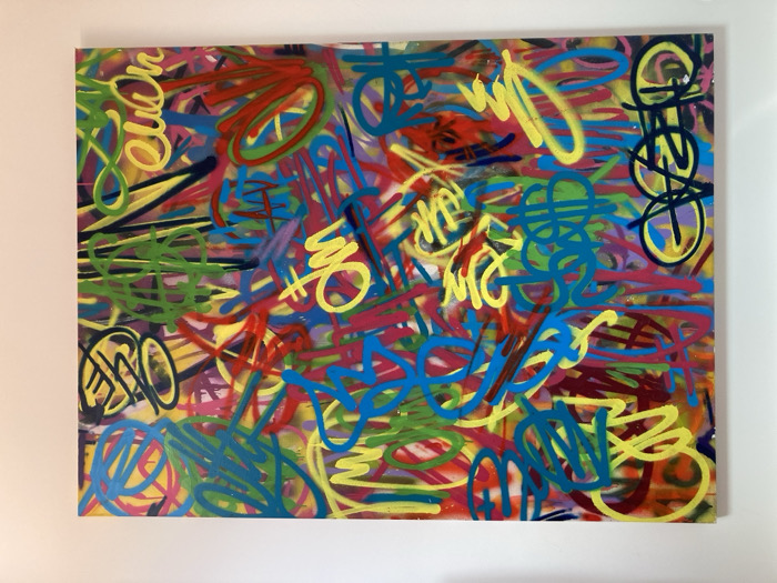 A rectangular canvas, approximately 3:2 in aspect ratio (width to height), displays an abstract artwork composed of multiple overlapping layers of vivid, curvilinear strokes. The dominant colors include fluorescent yellow, bright green, electric blue, red, and hot pink, applied over a darker, interwoven background of purple, maroon, and black elements. The strokes resemble stylized graffiti tags and calligraphic forms, covering the entire canvas surface without discernible empty space. The artwork exhibits a slight sheen, consistent with a glossy finish or varnish, under direct lighting. The canvas is mounted centrally on a plain, light-colored wall, visible at its left, top, and right edges, within an indoor setting in Boreti, Montenegro. No individuals, further objects, or explicit actions are present in the frame.