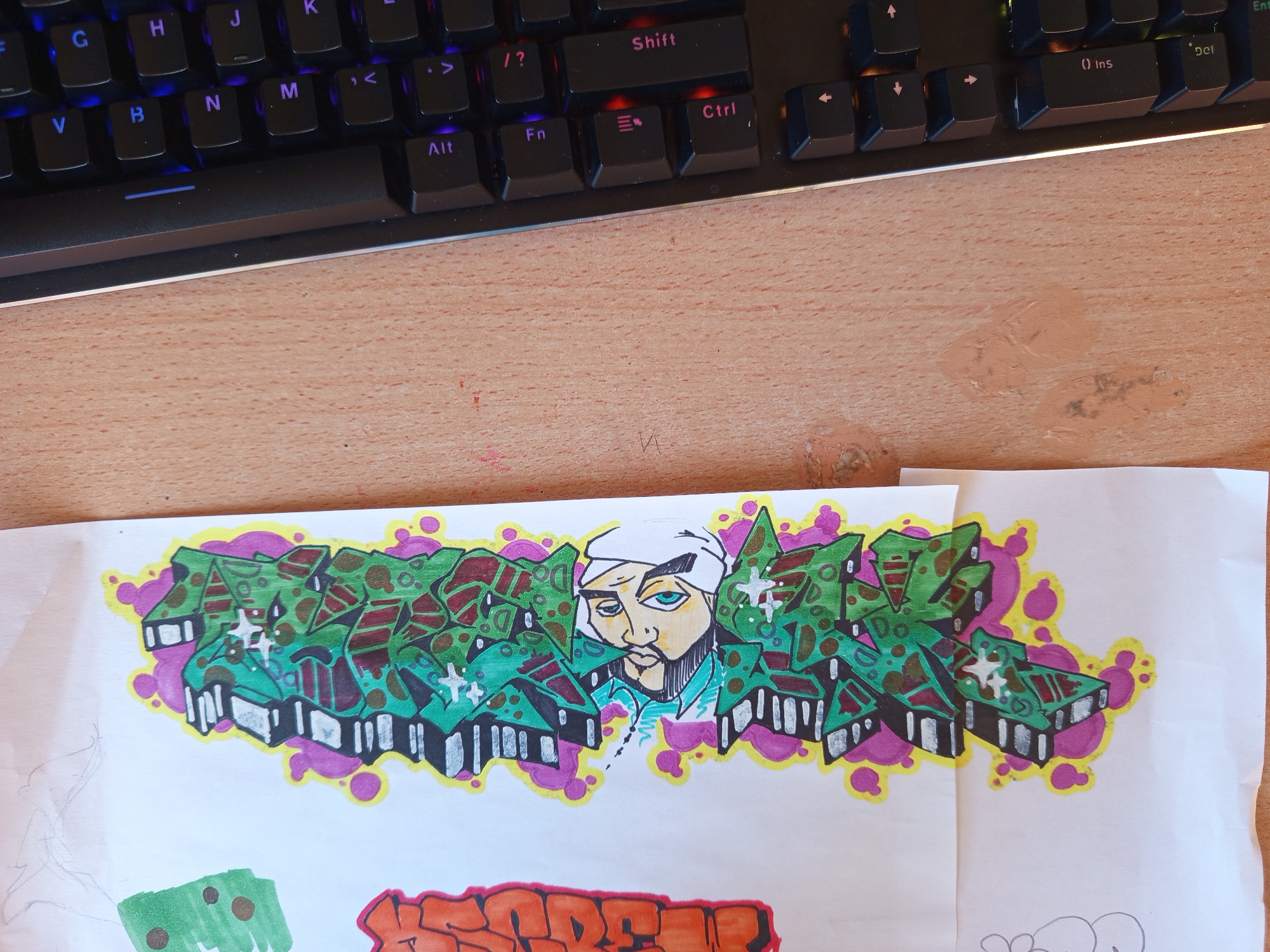 The image depicts an indoor desk scene in Svishtov, Bulgaria. On the left, multiple sheets of white paper display various graffiti-style artworks. The most prominent artwork, oriented vertically, features stylized block lettering rendered in green with brown stippling, black outlines, and white highlights, bordered by a yellow line and purple irregular shapes. Integrated into this green design is an inverted stylized face with light skin, blue eyes, and white hair accented with teal. To the immediate left, a partial orange graffiti design and a green block with brown dots are visible. Light pencil sketches of bubbly forms are present on a lower sheet of paper. The paper rests on a light brown wooden desk surface, which shows minor wear and discoloration. Along the right edge of the frame, a black mechanical keyboard is partially visible. Its keys are backlit, predominantly blue for alphanumeric keys and red for selected modifier and function keys such as 'Ctrl', 'Shift', 'Ins', and 'Del'. No individuals are present.
