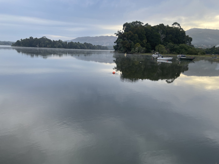 The image presents a tranquil riverine landscape in Vila Nova de Cerveira, Portugal, observed under an overcast sky during conditions suggestive of dawn or dusk