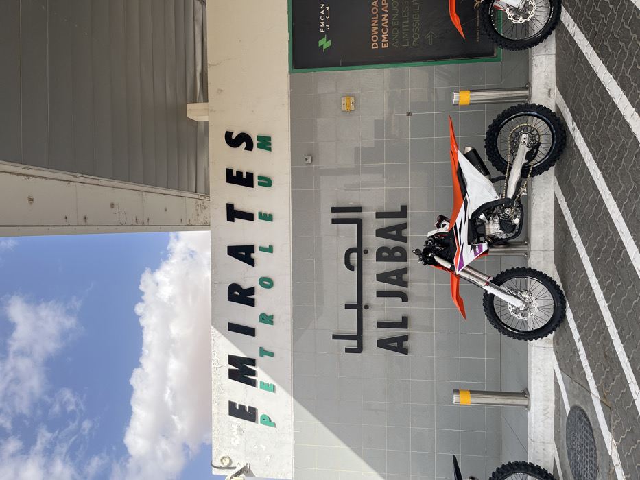 A vertically oriented shot shows a light gray building with "EMIRATES PETROLEUM" written vertically in English and a similar phrase in Arabic. Two orange and white KTM motorcycles are parked close to the building. A green advertisement is seen on the top right. The sky is visible in the bottom left corner, along with a few clouds. The ground is gray, striped with white lines.