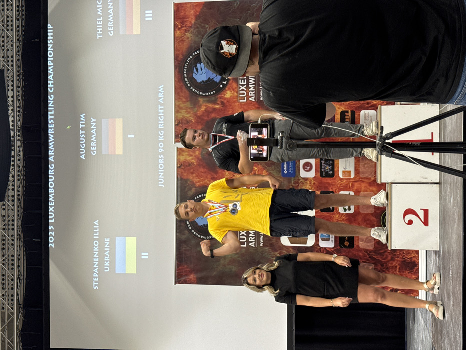 An indoor scene shows people on and around a stage. A woman in a black dress and heels stands near a man in a yellow shirt and black shorts, both with medals. Another man in a black shirt and gloves stands on a platform marked with "1". A man records with a device on a tripod. A screen displays the results of the 2025 Luxembourg Armwrestling Championship: Stepanenko Illia from Ukraine, August Tim from Germany, and Thiel Mic from Germany, Juniors 90 kg Right Arm.