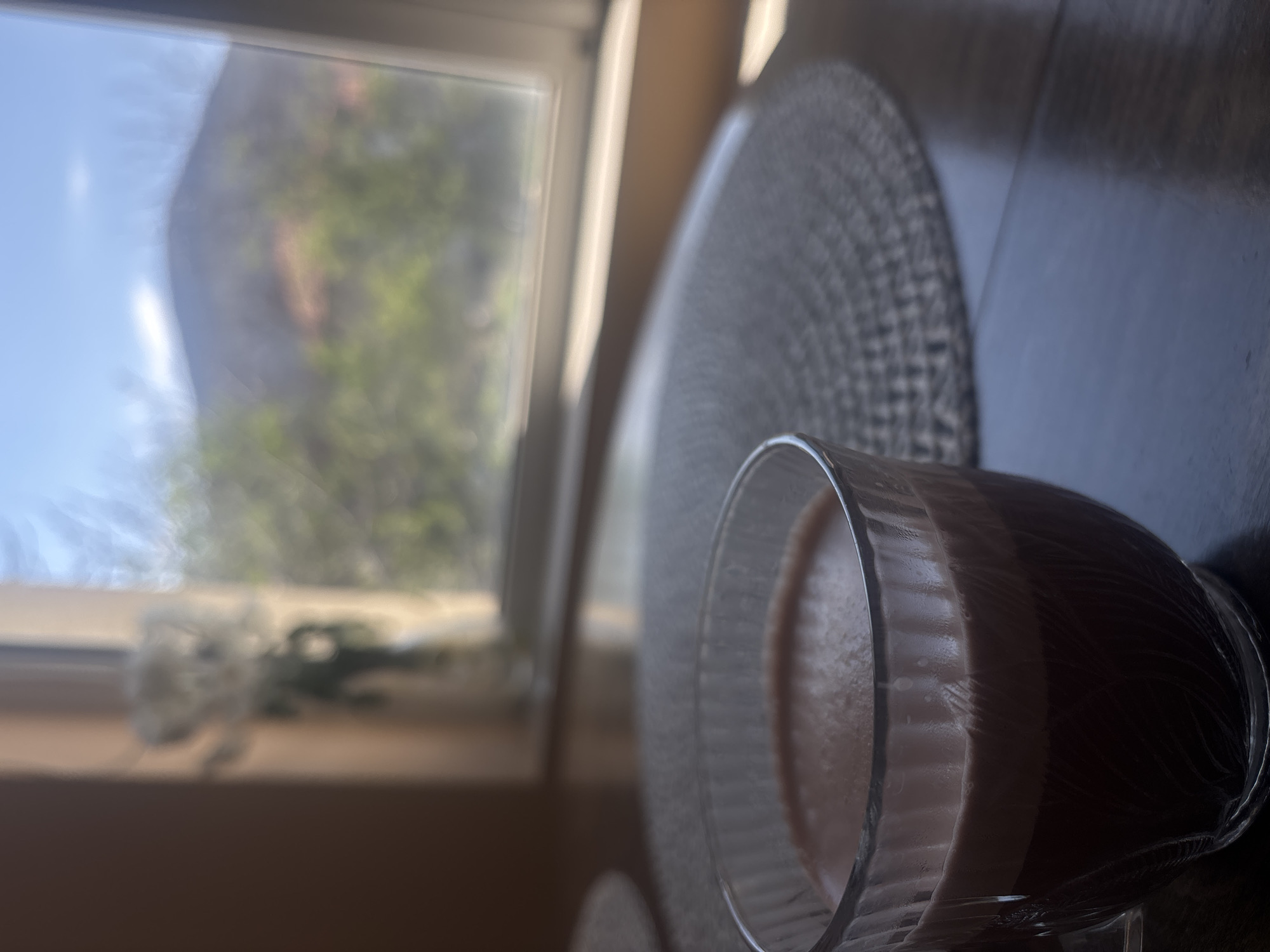 glass of hot chocolate on a wooden table. A round, woven placemat is under the glass. Outside the window, a blurred view reveals a mountain covered in trees under a clear sky. A blurred windowsill is visible with a small plant or decoration. The location is likely Markovo, Bulgaria, based on the prompt.