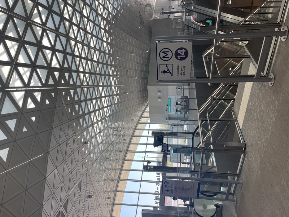 interior of a subway station located at 48.747, 2.373 in Thiais, France. The scene features a large open space with a geometric ceiling made of triangular panels, and large windows. The space is primarily made of light grey tile. There are two escalators, one on the left and one on the right, which both lead down to a lower level. In the foreground, a person dressed in black is standing at the top of the escalator on the right. A sign, on the right wall, denotes the metro line as M14 and the destination as "Saint-Denis Aeroprt d'Orly." The sign is in French. There is another, smaller sign next to the main sign which depicts a person walking up a set of stairs and the words "Accès piétons d'Only," which means "Pedestrian Access Only" in French. A large window behind the sign shows a clear view of the outside. There are several other doors visible in the image, one of which is marked "Tokens." A person in a black jacket and a blue bag stands next to the escalator on the left. This person is looking toward the right. The background is blurred, showing other areas of the station. The lights on the ceiling are on, casting a bright glow throughout the space.