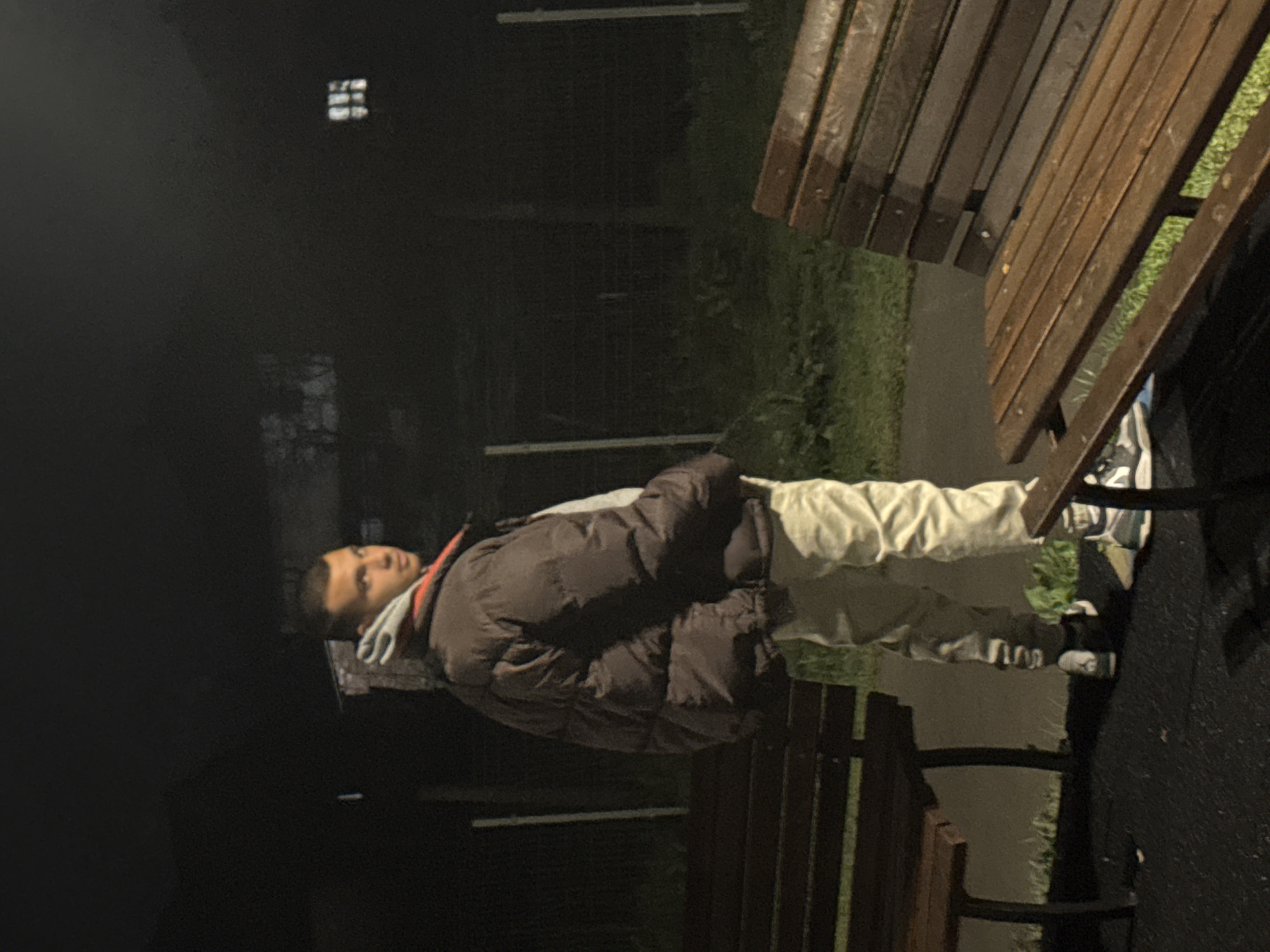 The scene depicts an outdoor nighttime setting in Valchedram, Bulgaria. A male individual stands centrally between two wooden park benches, turning his head to look over his right shoulder towards the camera. He is dressed in a dark brown puffer jacket worn over a grey hooded sweatshirt with an orange-red lining visible around the collar, light-colored (beige or off-white) trousers, and sneakers with dark and light accents. The ground beneath him and the benches appears to be a dark, wet paved surface, with patches of green grass visible beyond. In the background, a wire or mesh fence structure runs horizontally, and a distant building with a single illuminated window is discernible through the ambient darkness.