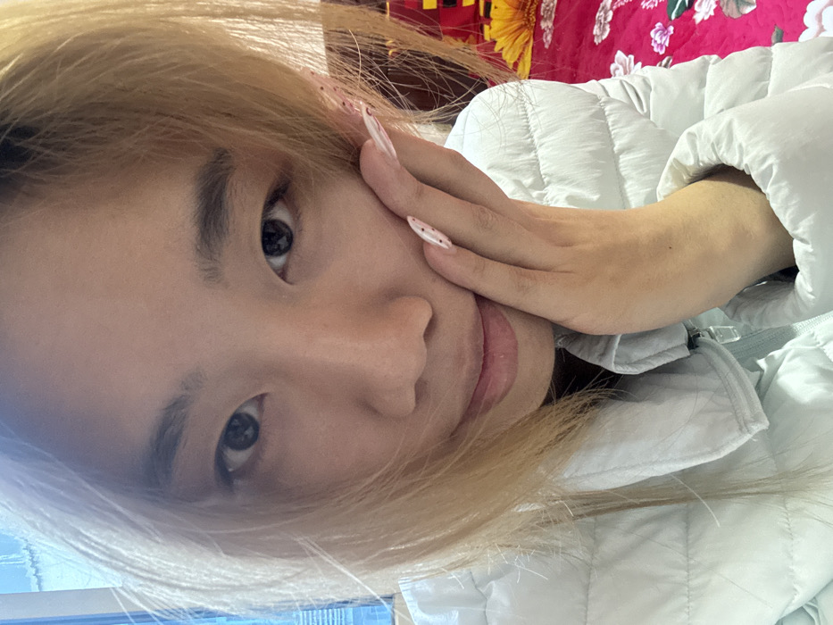 A female individual is depicted in a close-up, indoor portrait. Her head and upper torso are visible, positioned off-center to the right, with her gaze directed forward, engaging the viewer. She possesses light-colored, possibly bleached blonde, hair, parted on the left and falling across her forehead and cheeks. Her right hand is raised, with fingers splayed, and gently presses against the lower right side of her face, partially obscuring her chin. The nails on her right hand are long, pointed, and adorned with a pink base and small, dark polka dots. She is wearing a light-colored, possibly light blue or white, quilted puffer jacket with a zippered front, partially visible collar, and vertical stitching. Her lips are slightly parted, displaying a faint smile. In the background, to the left, a light-blue, possibly window blind or shutter, is visible, suggesting an exterior opening. To the right, a vibrant red and pink floral pattern, consistent with a textile such as a blanket or bedspread, is present. A large, yellow artificial flower, possibly a gerbera daisy, is also visible on this patterned textile. No specific visual elements confirm the location as the city of Guandu, China. The lighting suggests an indoor setting with ambient light.