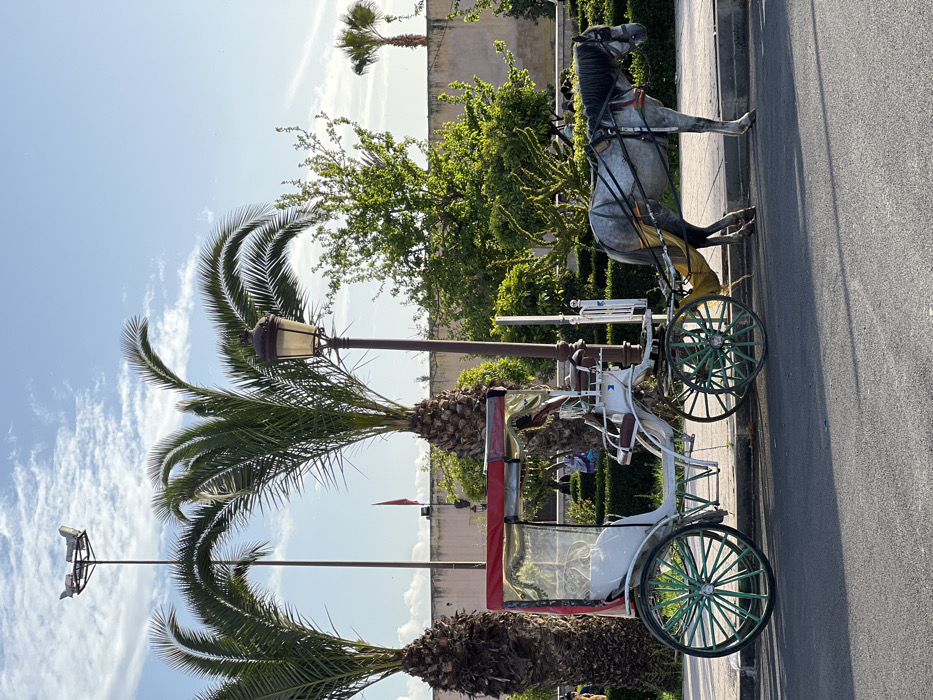 The scene depicts an asphalt road in Al Machouar – Stinia, Morocco, under a blue sky with scattered white clouds. A light grey horse with a dark mane and tail is standing stationary, facing right, harnessed to a white horse-drawn carriage. The carriage features green spoked wheels and a red-trimmed clear plastic canopy. Yellow decorative fabric is draped over the horse's rear harness. Adjacent to the carriage, a dark, ornate streetlamp post with a lantern head is present. To the left, two tall palm trees with thick, textured trunks and green fronds are prominent. In the background, a light-colored wall stretches horizontally, fronted by dense green foliage, including additional trees and manicured hedges. Obscured figures of people are visible among the background greenery, suggesting pedestrian activity. On the far left, a tall metallic pole supports a multi-directional high-mast light fixture. Shadows on the asphalt road indicate direct sunlight from the upper left quadrant.