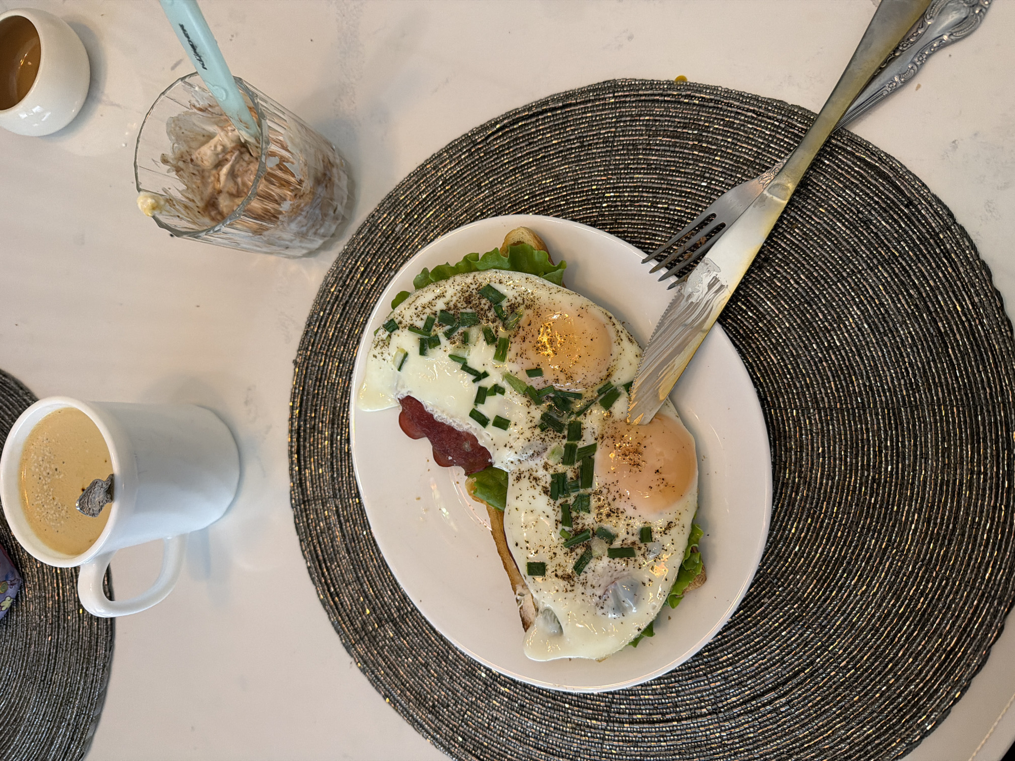 A top-down view shows a breakfast setting on a white countertop. A round, dark-gray beaded placemat holds a white plate with a sandwich topped with two fried eggs, greens, herbs, and a strip of meat. A fork and knife rest diagonally across the plate. To the left are a mug of coffee with a spoon in it, and a glass with remnants of a dessert. A small white pot is behind the glass. Location: Chaikovsky, Russia (inferred based on background clues not fully visible in the image).