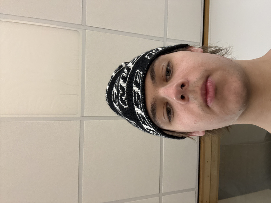 A person wearing a black and white patterned beanie looks directly at the camera. The individual has fair skin, light brown hair peeking out from under the hat, and neutral facial expression. A tiled wall is visible in the background, along with a partially visible doorway or window frame. The image has been rotated.