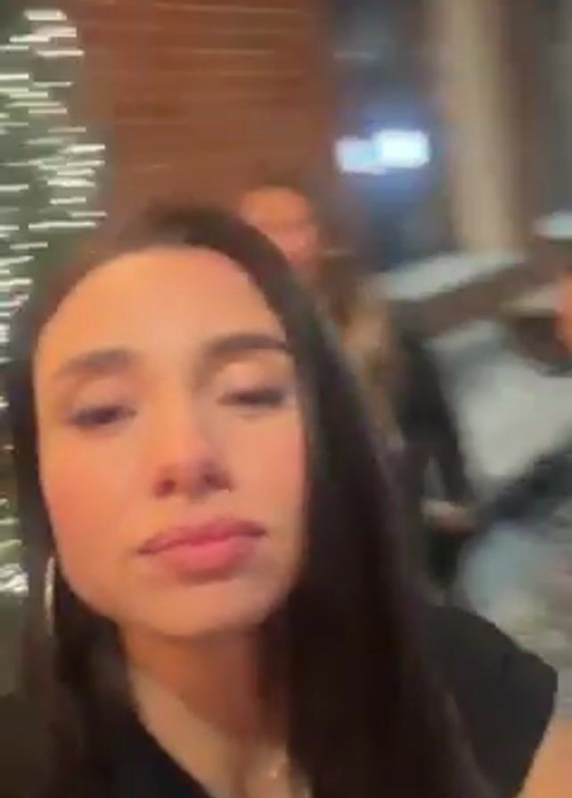 A woman is taking a selfie video at night on a street, with music playing. Initially, she's by herself in frame, then a bald man with sunglasses and a bandana comes running up behind her, holding what looks like a small glass. As the video continues, two other women are visible in the background, one with a scarf and furry jacket, dancing. The background includes buildings and snow.