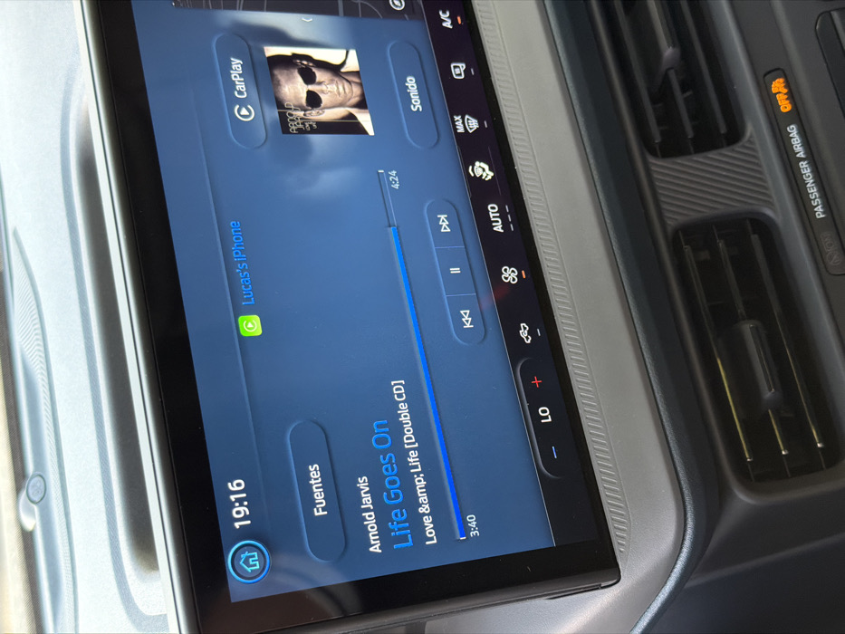 A car's infotainment system displays the song "Life Goes On" by Arnold Jarvis from the album "Love & Life [Double CD]" at 3:40 of the total song length of 4:24. The music source is "Lucas's iPhone" connected via CarPlay. Various car functions are visible, including climate control (A/C, MAX, AUTO), volume (LO), and the passenger airbag status as "OFF." The time is 19:16.