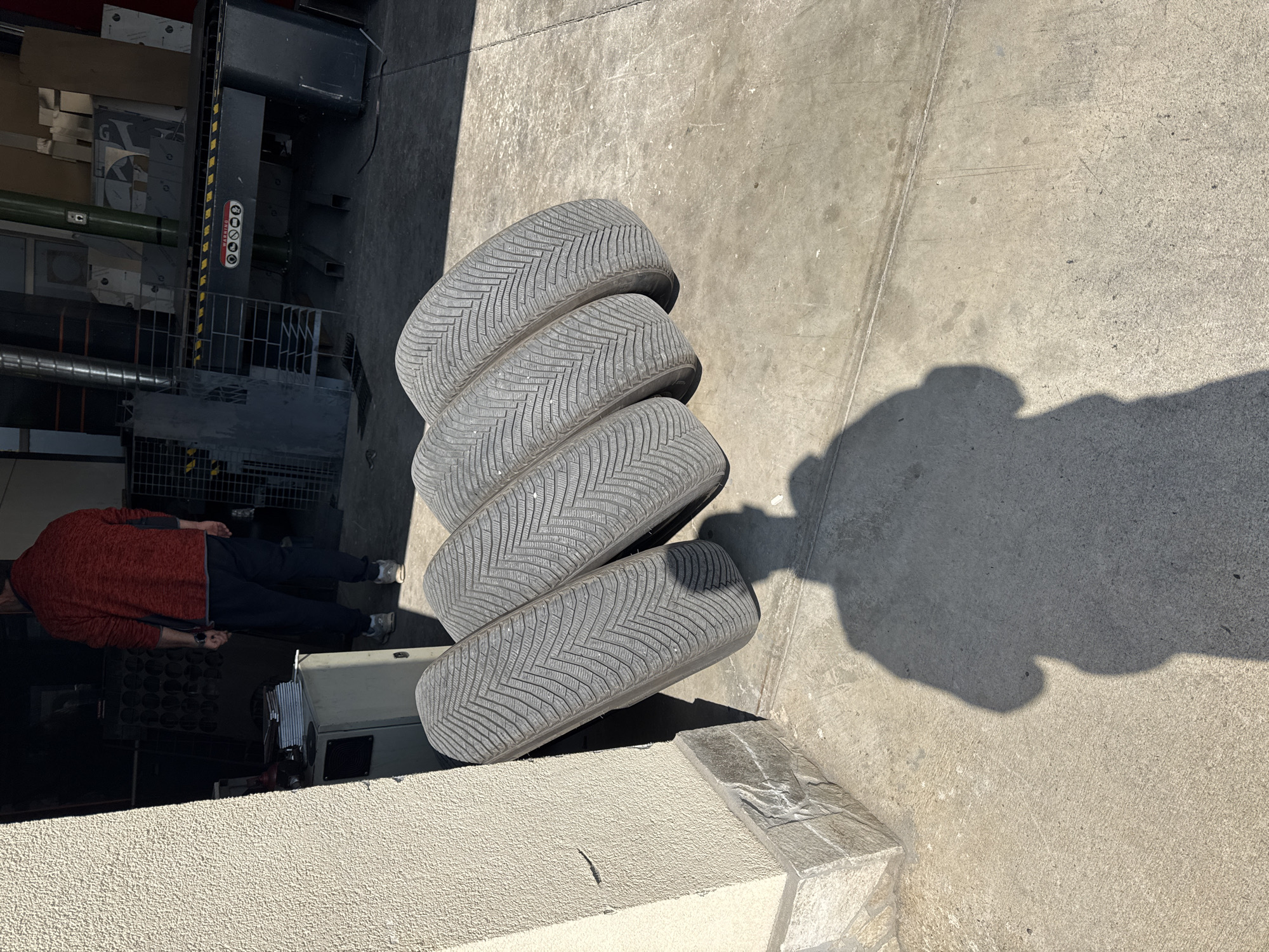 The scene depicts an outdoor concrete area adjacent to a building in the city of Kazichene, Bulgaria. In the immediate foreground, four dark grey all-season tires with a distinct chevron tread pattern are positioned upright, leaning against a textured, light-colored stucco pillar. The base of the pillar is clad with light grey stone or concrete blocks. A large, indistinct human shadow is cast onto the concrete ground in the lower-center, indicating the position of the photographer relative to the strong overhead sunlight. In the mid-ground, an adult male, seen from behind, is standing near an entrance to what appears to be a workshop or industrial facility. He is wearing a red, heathered long-sleeved shirt, dark blue or black pants, and light-colored athletic shoes. A dark watch is visible on his left wrist. The interior of the facility, visible beyond the man, contains industrial machinery. A prominent dark-colored machine with yellow and black striped safety tape and red warning labels ("WARNING" and hazard symbols) is visible. Behind it, various metal structures, possibly shelving or equipment components, and stacks of materials are present. A tall, dark green vertical pipe or column is also visible. To the left of the man, a light-colored utility cabinet with a ventilation grille is situated against the wall, with a stack of papers or flat objects on its top surface. The ground is a worn concrete slab with visible seams and minor irregularities. The overall lighting is bright, with strong shadows indicating direct sunlight.
