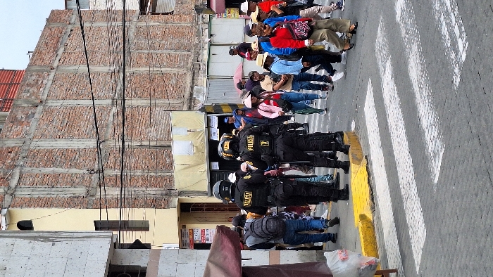 The scene depicts a street in Miraflores, Peru, populated by pedestrians and two uniformed police officers under an overcast sky