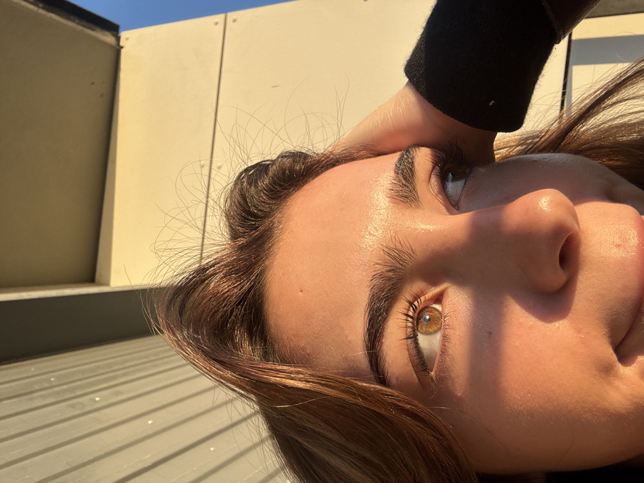 The image displays a close-up, partial portrait of a young individual outdoors in Loures, Portugal. The subject exhibits brown hair with lighter highlights, thick dark eyebrows, and hazel-brown eyes directed upwards and to the viewer's right. A small mole is visible on the forehead. The right hand's fingers rest near the right temple, partially obscured by a black sleeve. Strong, warm sunlight illuminates the left side of the face, casting pronounced shadows from the nose and brow. The lower portion of the face shows a slight upward curve of the mouth. The background features architectural elements: a dark, possibly paneled wall section on the upper left, and a lighter, flat cream-colored wall section with visible seams and fasteners on the upper right, beneath a clear blue sky.