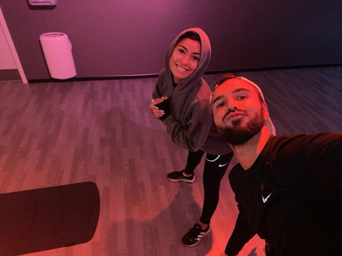 This indoor image, captured in Wattrelos, France, displays two individuals within an environment illuminated by strong reddish-purple ambient light. An adult male is positioned in the right foreground, holding the camera to take a selfie. He has a trimmed beard, wears a white headband, and a black long-sleeved shirt featuring a white Nike logo on the left chest. He is looking directly at the camera with a slight smile. An adult female stands behind and to his left, angled towards the camera and smiling broadly. She wears a grey hooded sweatshirt with the hood up, black athletic leggings with a white Nike swoosh logo on the left thigh, and black Adidas athletic shoes. Her left hand, encased in dark fingerless gloves, holds a small black electronic device. The background consists of a dark wall to the right and rear, transitioning to a lighter wall with white trim on the far left. A white cylindrical trash receptacle is mounted on the wall in the upper-left background. The floor is a light-colored, patterned wood or laminate. A dark rectangular object, consistent with an exercise mat, is visible on the floor in the lower left foreground.