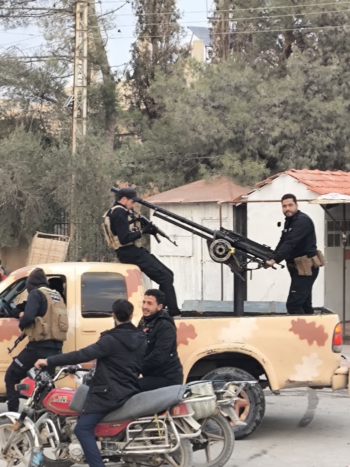 The image captures an outdoor scene in Jirud, Syria, featuring multiple individuals and two vehicles. A light-colored pickup truck, adorned with irregular brown camouflage patterns, is positioned centrally. A black twin-barrel heavy machine gun is mounted on a pedestal in its bed. On the left side of the truck bed, a male individual, dressed in black attire, a tan tactical vest, and a dark cap, is seated, holding a rifle. To the right of the mounted weapon, another male individual, wearing black clothing and a tactical belt with pouches, stands, gripping its handles. Partially visible in the driver's side of the truck cab is a person in a dark hooded jacket and a tan tactical vest, holding a rifle. In the foreground, a red motorcycle is occupied by two male individuals. The driver, wearing a dark jacket, is largely obscured from view, while the passenger, also in a dark jacket, is seated behind him, looking towards the right side of the frame and exhibiting a smile. The background consists of dense trees with green foliage. A tall metal utility pole is visible on the left. Behind the truck, structures include a white building with a red-tiled roof and an adjacent building with a corrugated metal roof. A distant building in the upper right background features solar panels on its roof. The ground surface in the immediate foreground appears to be paved.