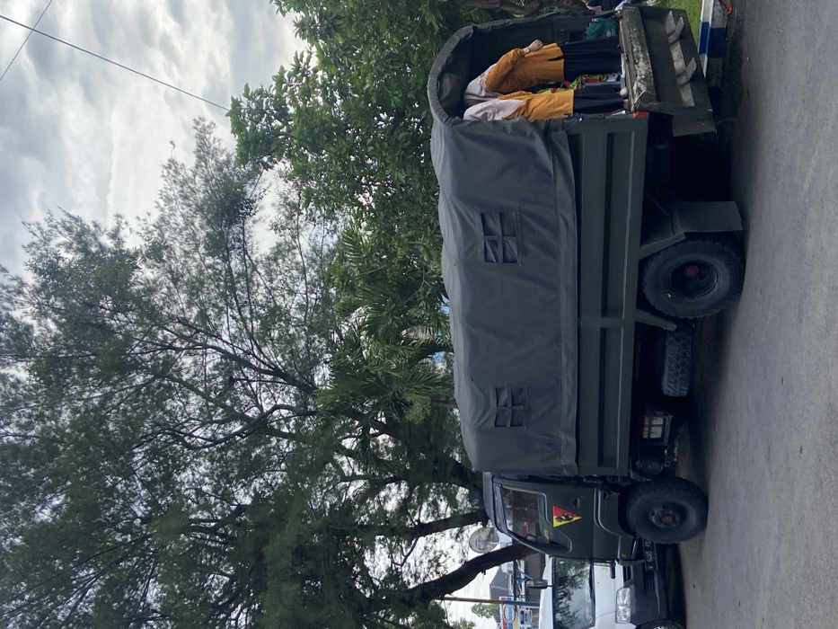 - "An olive drab military transport truck, complete with a canvas cover and two small square windows, is positioned on a street lined with other vehicles and a gas station" by FM-htxI33, licensed under CC BY 4.0