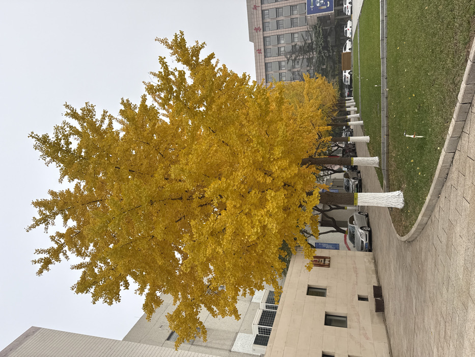 The image depicts an outdoor urban environment within Daxing District, China, under an overcast sky. A prominent row of deciduous trees, likely Ginkgo, displaying vibrant yellow autumn foliage, runs diagonally from the mid-ground towards the background right. The lower trunks of these trees are painted white, topped by a narrow yellow band. To the left, a light-colored multi-story building with a textured facade, featuring several rectangular windows (some with visible security bars) and externally mounted air conditioning units on a lower roof section, borders a paved pedestrian walkway composed of light-colored rectangular tiles. To the right and in the background, a large, grey multi-story building with uniformly spaced windows is visible. Partially legible Chinese characters, possibly "北事中" (Beijing Municipal Affairs Center or similar), and a large circular emblem are present on its facade, suggesting an institutional or governmental structure. A well-maintained strip of green grass, bordered by a concrete curb, separates the paved walkway from a parallel paved road or parking area, where multiple vehicles, including a silver sedan, are parked. No individuals are present in the scene.