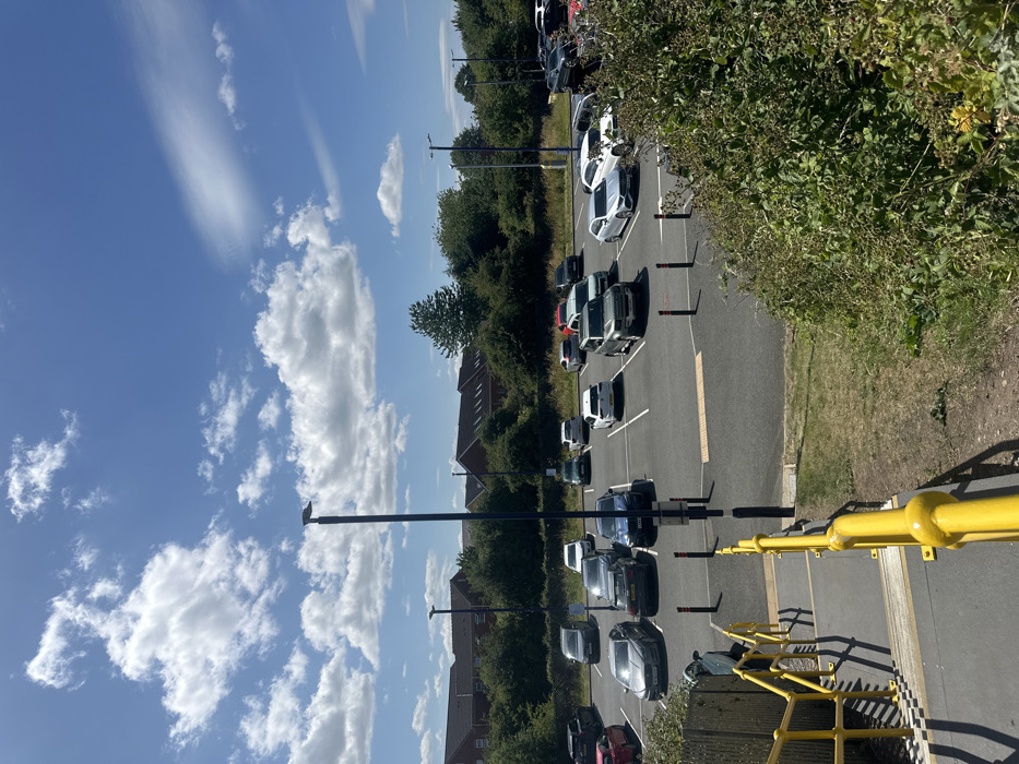 A parking lot scene under a blue sky with scattered clouds
