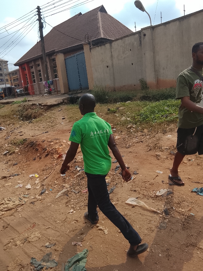 The scene depicts a daylight street view in Onitsha, Nigeria, featuring an unpaved, reddish-brown dirt ground covered with scattered refuse, including plastic bags and debris. Sparse green vegetation grows along the edges of the path. In the foreground, an adult male with short dark hair walks away from the camera, wearing a bright green short-sleeved polo shirt with white Chinese characters and "Zhejiang University of Technology" printed on the back. He wears dark trousers and dark slip-on shoes, with his left leg extended forward in mid-stride. To his right, another adult male is partially visible, walking in the same direction. He wears a dark green short-sleeved t-shirt with a graphic design on the front, dark shorts, and black flip-flops. In the mid-ground, a tall, light-colored concrete wall stretches horizontally, featuring dark marks and several impact points or holes. Barbed wire is affixed along the top edge of this wall in sections. A curved streetlight fixture is mounted above the wall on the right. Behind a segment of the wall and to the left, a two-story building with a brown, pyramidal tiled roof is visible. Its facade features red-painted vertical elements, and a blue double metal gate is set into a lower wall in front of it. Clothes are hanging on a line near the lower part of this building. A dark utility pole with numerous overhead wires stands on the far left. In the distant left background, additional buildings and a yellow auto-rickshaw are partially discernible.