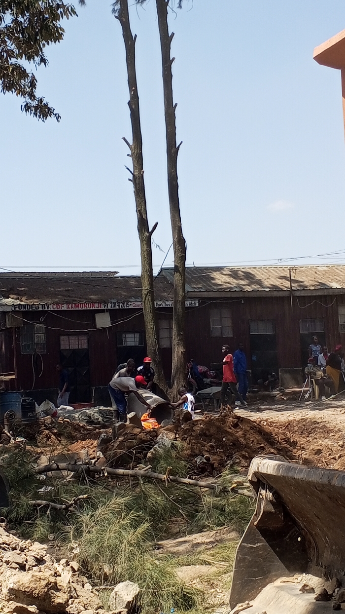A group of men work around a construction site. Two tall trees stand in front of a long, one-story building labeled "FUNDED BY CDF KAMUKUNJI FY 2014/2015." Some people stand and sit in front of the building. Debris, including tree branches, sits in front of the workers. A portion of an excavator bucket is in the foreground. The sky is light blue.