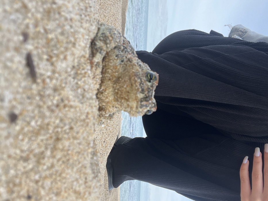 A low-angle shot on a sandy beach in Shkorpilovtsi, Bulgaria, shows a sand-covered toad in the foreground, facing the viewer. The toad has prominent green eyes and a textured, mottled brown and grey appearance due to the sand adhering to its skin. It is stationary on light brown sand. In the midground, directly behind the toad, a person is partially visible in a crouching position. The person wears dark, ribbed wide-leg trousers and a dark shoe on the right foot. A portion of a light blue denim jacket is visible on the upper left, and a hand with light-colored manicured fingernails is visible on the right side of the frame, near the person's leg. The background features calm, light blue-green ocean water under an overcast sky.