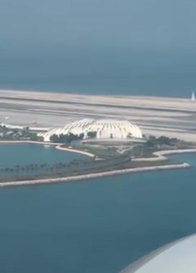 From an airplane window, the camera captures an aerial view of an airport near the ocean. A large, dome-shaped building with white latticework on its exterior is visible on a small peninsula. The airport's runways are wide and light-colored, and smaller buildings are scattered around the area. A row of palm trees lines the edge of the water. The sea is a deep blue, and the sky is a hazy light blue. A portion of the airplane wing is visible in the lower right corner of the frame.