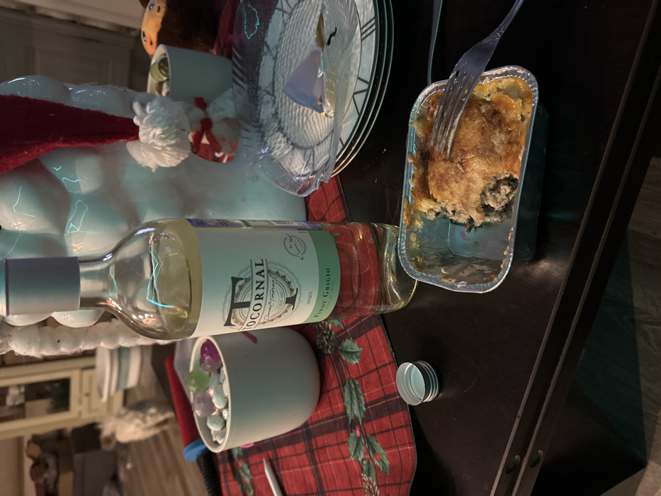 A table setting includes a clock-themed plate, a foil container of lasagna being eaten with a fork, and a bottle of "Tocornal Pinot Grigio" wine. A small white pot with colorful stones sits near the wine. A red and green plaid runner underlies the objects, with the wine bottle lying horizontally. A decorative snowman is partially visible, adding a festive touch.