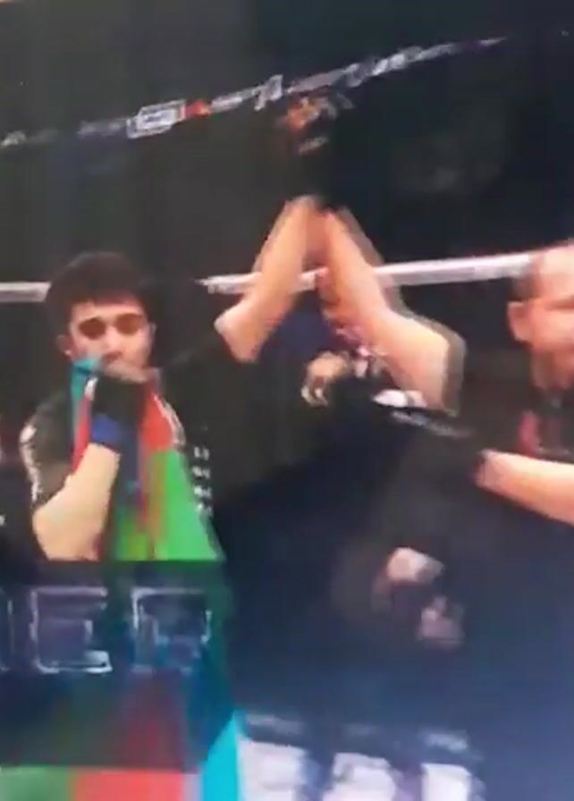 mixed martial arts (MMA) fight, likely an Octagon Fighting Championship event. The winning fighter, wearing black shorts and a top, is being declared the victor and his hand is being raised by the referee. He is holding the flag of Azerbaijan. His name, "Madali Nurusov" is displayed on the screen. Another fighter, wearing white shorts and no shirt, is standing nearby. There are other people surrounding the fighting ring including referees and other staff. The environment appears to be indoors at an arena or venue set up for MMA fights. The atmosphere suggests a celebratory moment.