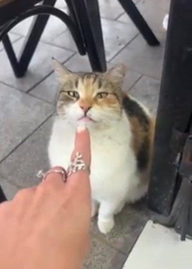 calico cat sitting on a tiled floor next to an outdoor cafe table. A hand wearing several rings reaches out and touches the cat's nose. The cat licks its nose and then moves away from the hand, standing under the table.