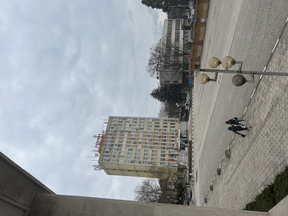 This image presents an elevated, wide-angle view of a public square in Cherven Bryag, Bulgaria, under an overcast sky. The prominent subject is a multi-story building, approximately ten stories high, with a yellow and orange facade, located in the mid-ground. The building's roof features a red sign reading "ОБЩИНА ЧЕРВЕН БРЯГ" (Municipality Cherven Bryag) and several antenna structures. Various flags are displayed at its ground-level entrance, where several individuals are visible. To the right of this central building, a large, illuminated numeral display spelling "2026" is situated. Further to the right, a multi-story grey building with numerous windows is partially visible, along with several bare deciduous trees and evergreen trees. The foreground consists of a large, paved square with a pattern of light-colored tiles. Two individuals, one dressed in dark clothing carrying an object, and another in a maroon top and blue jeans, are walking across this paved area from the lower right towards the upper left. A tall, dark grey streetlamp with five spherical, amber-toned light fixtures extends into the lower right quadrant. Along the right edge of the square, a line of wooden market stalls with light-colored roofs is arranged. Several vehicles are parked in various areas around the square. The top left corner is partially obstructed by a concrete architectural element.