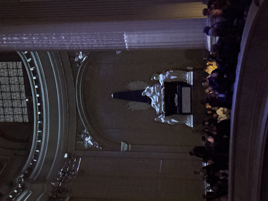 The image captures a dimly lit interior view of the Pantheon in Paris, France