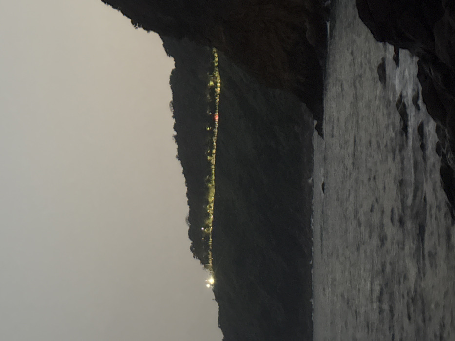 The image captures an evening or night coastal scene in Sơn Trà Ward, Vietnam. The foreground consists of dark, choppy water with scattered rocks visible along a rocky shoreline. A steep, densely forested hillside rises from the water, occupying the mid-ground and background. A continuous line of artificial yellowish-white lights delineates a road or path carved into the upper elevation of the hill, extending horizontally across the frame. Two more intensely bright white lights are present further left along this illuminated section, possibly from structures. A solitary red light, consistent with a vehicle's taillight, is observable along the illuminated path towards the right. The sky is a uniform dark grey, indicating low light conditions. No human figures are discernible.