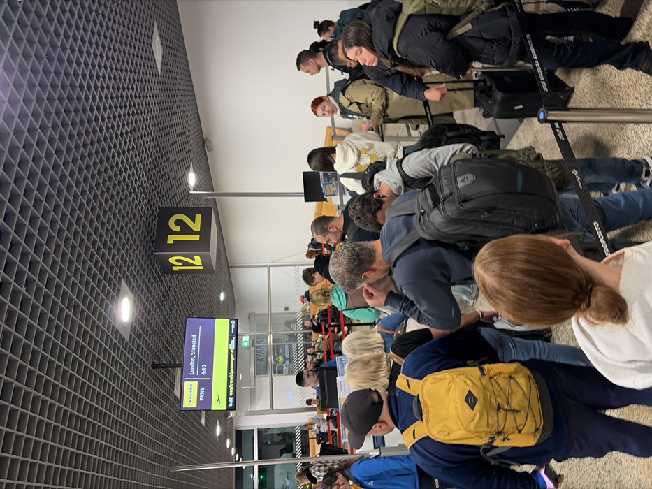 The image displays an indoor airport gate area, identified as Gate 12, at Madeira Airport in Santa Cruz, Madeira, Portugal. A digital screen centrally visible indicates "RYANAIR FR3938" bound for "London, Stansted" with a time of "6:10." Approximately 25-30 individuals, primarily adults of varying ages, are queued in multiple lines, delineated by barrier tapes bearing the text "2023 MADEIRA AEROPORTO." The passengers are dressed in casual travel attire, many carrying backpacks (including a distinct yellow backpack on a male in the foreground and a large black one on another male) and various pieces of rolling carry-on luggage. The environment features a gray grid ceiling with recessed lighting, white walls, and a glass partition in the background, behind which airport staff and additional seating are partially visible. The scene depicts passengers in a waiting posture, standing in line, presumably for boarding or gate processing.