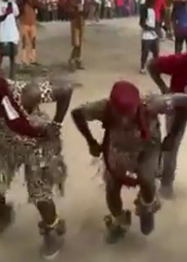 The video captures a vibrant cultural performance taking place outdoors on a sandy surface. A group of male dancers, dressed in an array of costumes, are the focal point. Some wear red tops and dark pants, while others are adorned in patterned garments resembling animal prints, paired with red headwear. One individual stands out with a more elaborate costume consisting of a patterned cloak, headwear resembling a mask, and other decorative elements. The dancers are engaged in synchronized movements, bending forward and seemingly stomping their feet, generating dust from the sandy ground. Spectators surround the performance area, observing the spectacle with interest. A mobile phone can be seen in the foreground, indicating that someone is recording the event. A tree is also present in the background, further establishing the outdoor setting. The overall atmosphere appears to be one of celebration and cultural expression.
